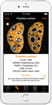 Species - An alphabetical listing of species of Nudibranch to be found from each Region in a scrollable index that provides access to individual species views containing a large photo and information about the selected species.